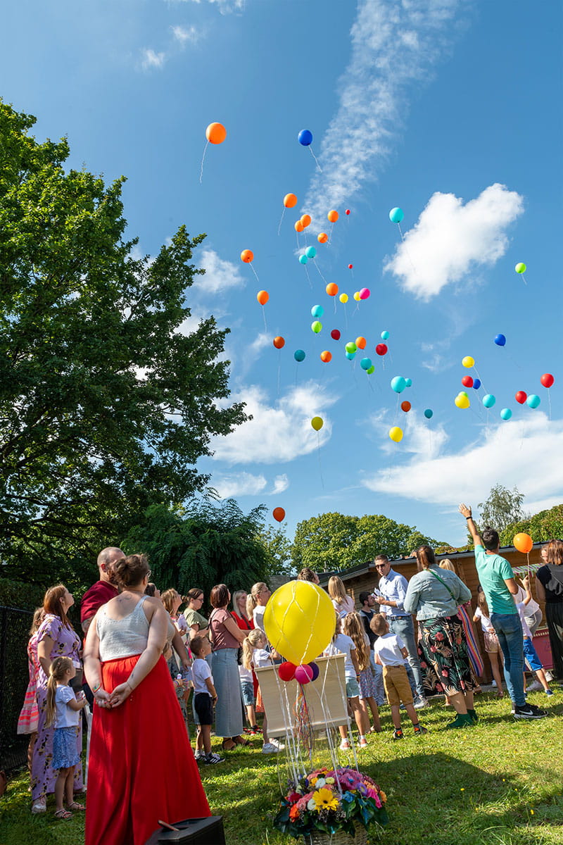 ‘Deze ceremonie was geen traditionele uitvaart, maar een afscheid met veel glitters. Er waren ballonnen, bellenblazers en een fiets met ijsjes na de uitvaart. De kist werd naar buiten gedragen onder muziek van K3 en Camille.’